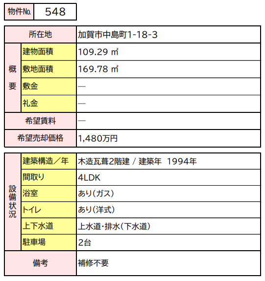 548(物件詳細) 売買 所在地 加賀市中島町1-18-3 位置図 面積(建物) 109.29 ㎡ 面積(土地) 169.78 ㎡ 売却希望価格 1,480万円 建築構造/建築年 木造瓦葺2階建 / 建築年 1994年 浴室・トイレ あり(ガス)・あり(洋式) 上下水道 上水道・排水(下水道) 駐車場 2台 間取り 間取り図のとおり 備考 補修不要 物件一覧へ戻る
