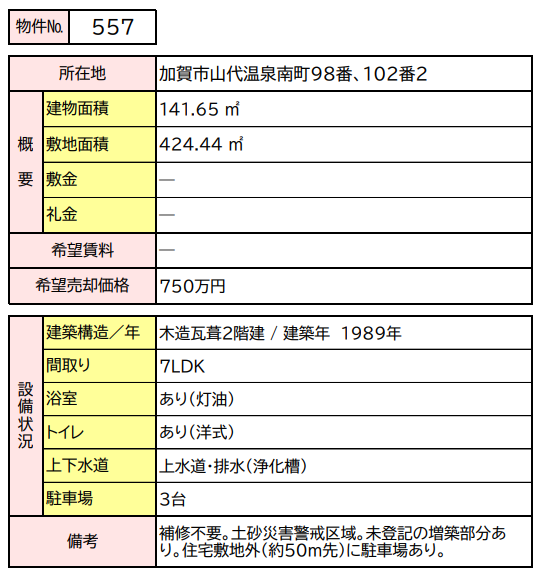 557(物件詳細) 売買 所在地 加賀市山代温泉南町98番、102番2 位置図 面積(建物) 141.65 ㎡ 面積(土地) 424.44 ㎡ 売却希望価格 750万円 建築構造/建築年 木造瓦葺2階建 / 建築年 1989年 浴室・トイレ あり(灯油)・あり(洋式) 上下水道 上水道・排水(浄化槽) 駐車場 3台 間取り 間取り図のとおり 備考 補修不要。土砂災害警戒区域。 未登記の増築部分あり。 住宅敷地外(約50m先)に駐車場あり。 物件一覧へ戻る