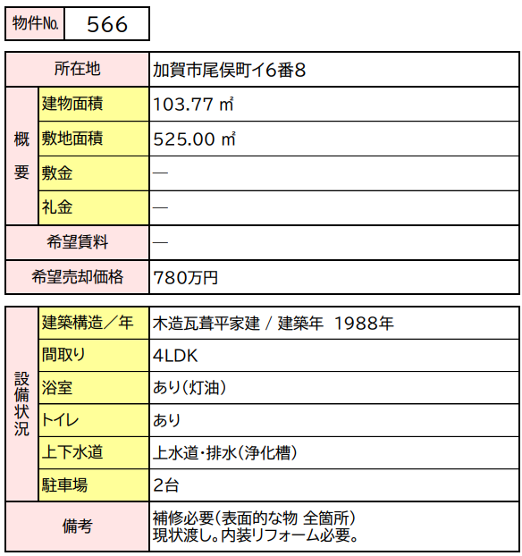 566(物件詳細) 売買 所在地 加賀市尾俣町イ6番8 位置図 面積(建物) 103.77 ㎡ 面積(土地) 525.00 ㎡ 売却希望価格 780万円 建築構造/建築年 木造瓦葺平家建 / 建築年 1988年 浴室・トイレ あり(灯油)・あり 上下水道 上水道・排水(浄化槽) 駐車場 2台 間取り 間取り図のとおり 備考 補修必要(表面的な物 全箇所) 現状渡し。内装リフォーム必要。 物件一覧へ戻る