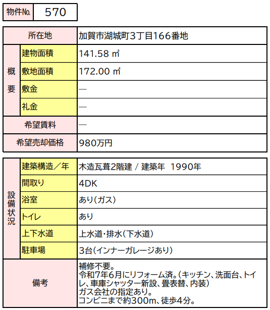 570(物件詳細) 売買 所在地 加賀市湖城町3丁目166番地 位置図 面積(建物) 141.58 ㎡ 面積(土地) 172.00 ㎡ 売却希望価格 980万円 建築構造/建築年 木造瓦葺2階建 / 建築年 1990年 浴室・トイレ あり(ガス)・あり 上下水道 上水道・排水(下水道) 駐車場 3台(インナーガレージあり) 間取り 間取り図のとおり 備考 補修不要。 令和7年6月にリフォーム済。(キッチン、洗面台、トイレ、車庫シャッター新設、畳表替、内装) ガス会社の指定あり。 コンビニまで約300m、徒歩4分。 物件一覧へ戻る