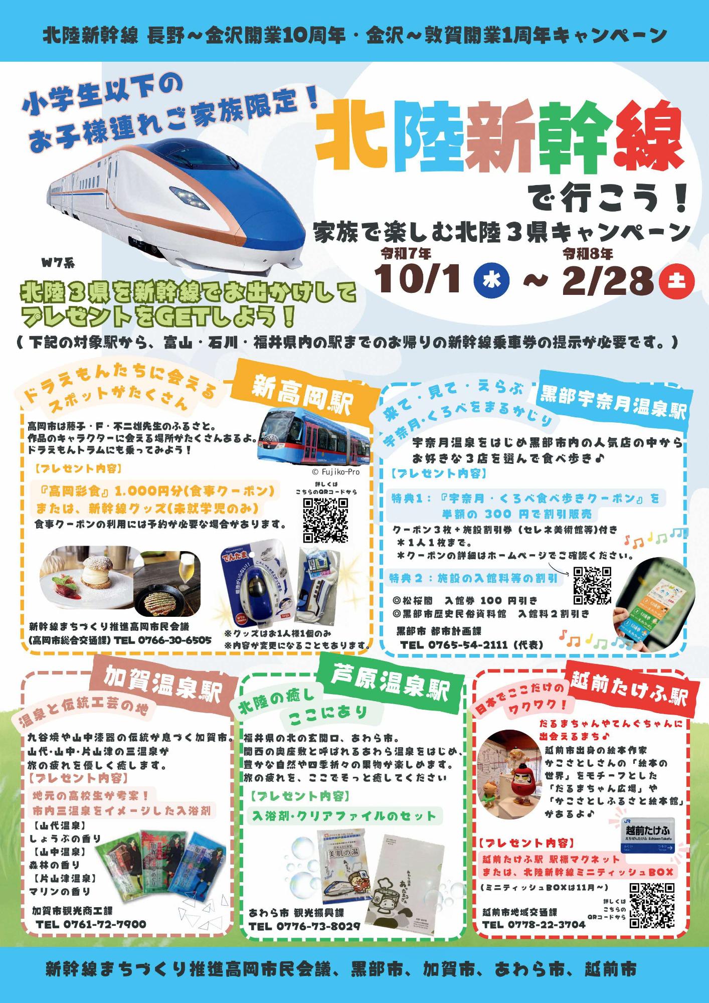 小学生以下のお子さまを含むご家族が、福井・石川・富山県内の新幹線駅から、この3県内にある対象駅まで北陸新幹線を利用されると、素敵なプレゼントお渡しするキャンペーンを実施します。