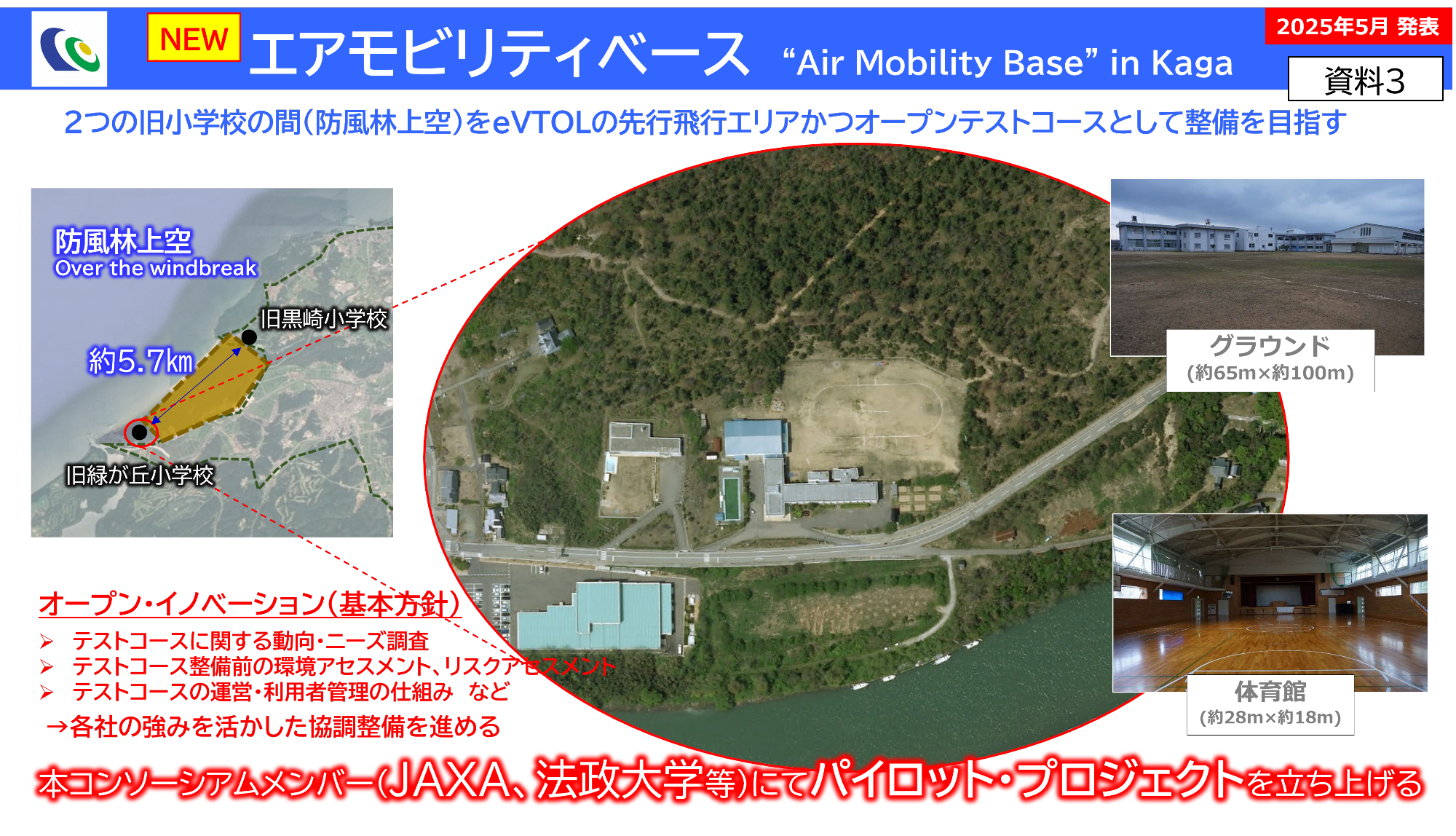 (2)エアモビリティベース:2つの旧小学校の間をeVTOLの先行飛行エリアかつオープンテストコースとして整備を目指すもの。